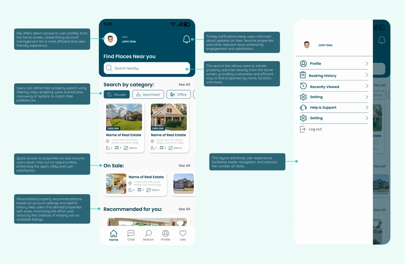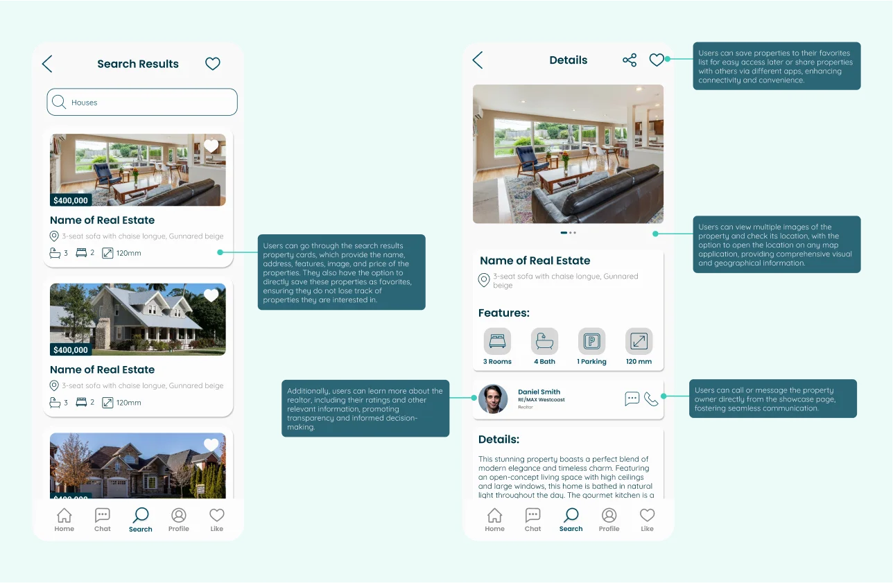 - Integrated Communication:Allowing realtors to set meetings and viewing appointments directly through the app, eliminating the need for additional apps. This approach leverages key UI/UX principles such as user-centered design, acc