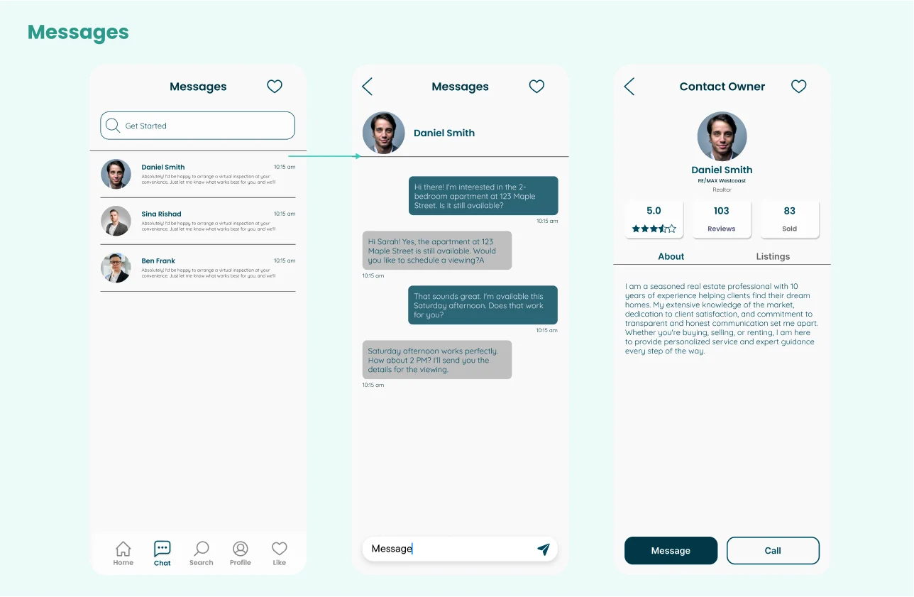 The Messages screen facilitates seamless and secure communication between users and property managers, allowing users to ask questions, schedule viewings, and negotiate terms.